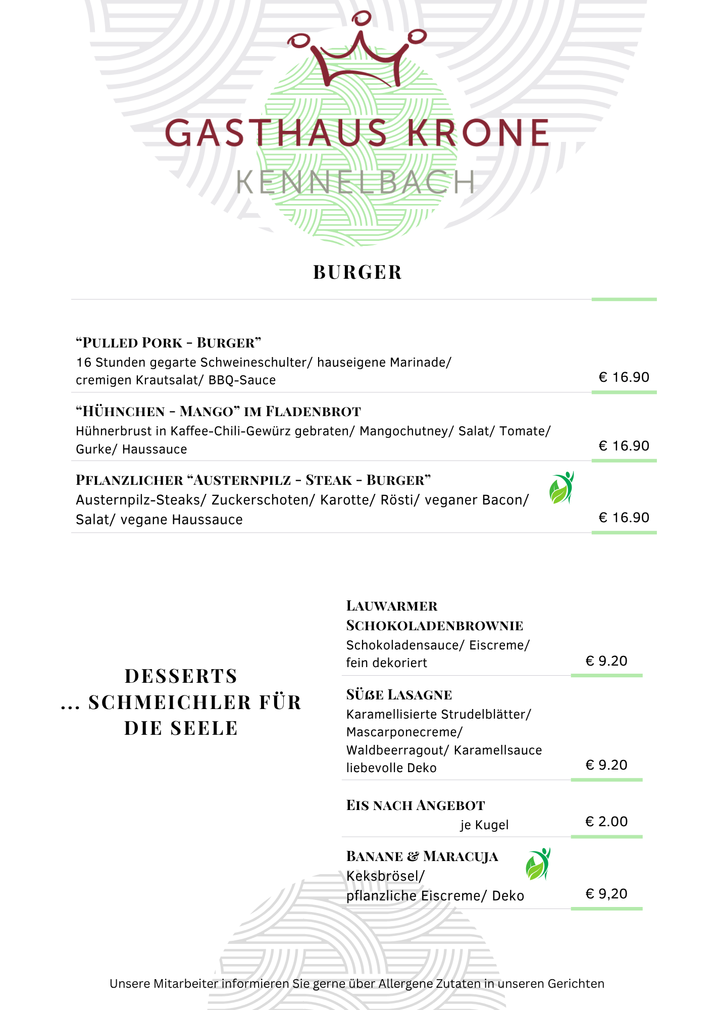 Unsere Speisekarte bietet eine Mischung aus exotischen Highlights und schmackhaften traditionellen Gerichten. Unsere Mitarbeiter informieren Sie gerne über Allergene und Zutaten.